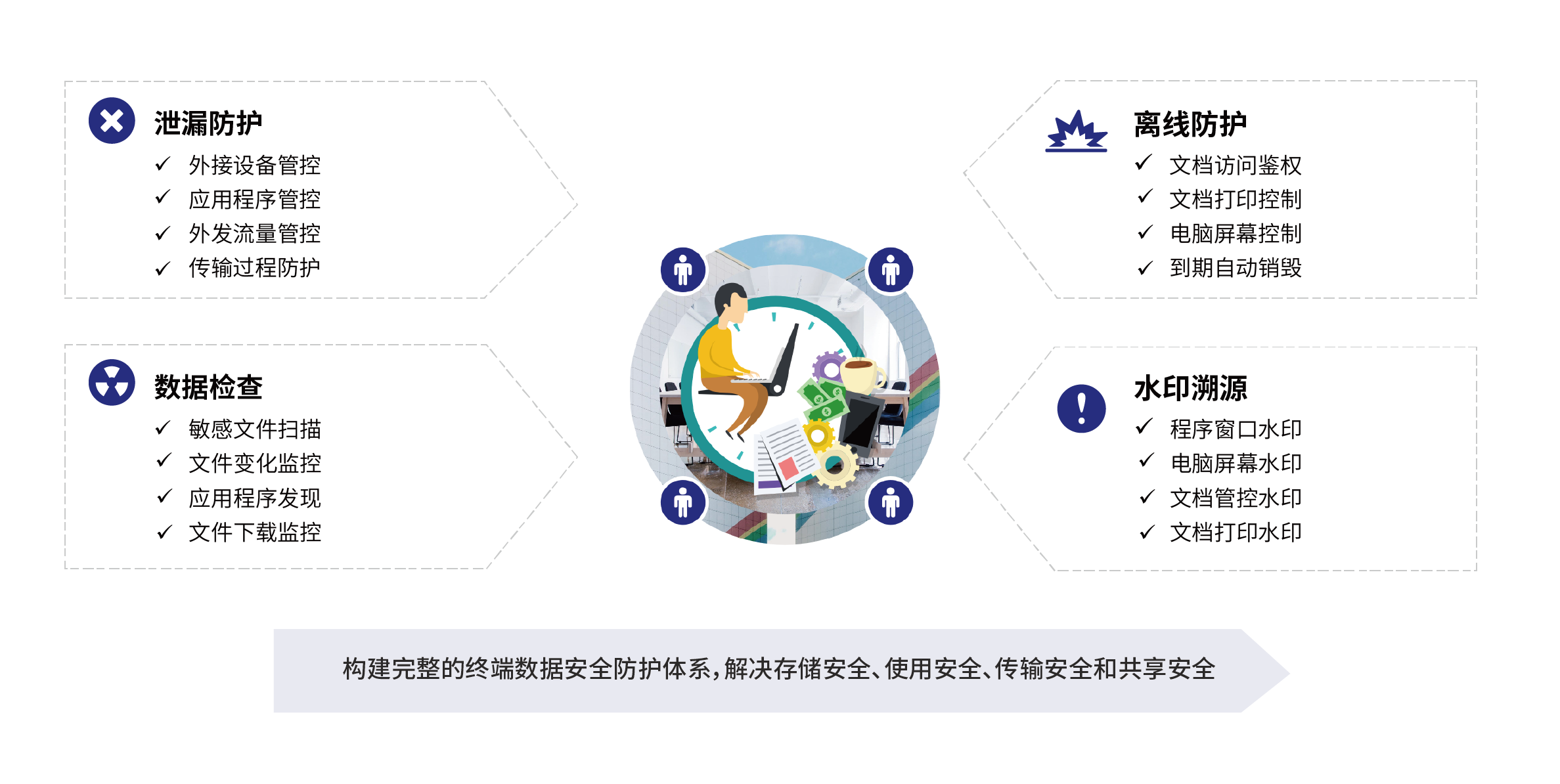 闪捷终端防泄漏产品部署在终端电脑上,通过操作系统底层技术和对接机制,对终端电脑上的泄漏风险,如U盘拷贝、文件打印、微信消息、屏幕截屏、电子邮件、文件上传等行为进行实时监控,阻止终端使用人员私自将获取到的敏感数据泄漏,同时对离开终端电脑的数据提供溯源手段。