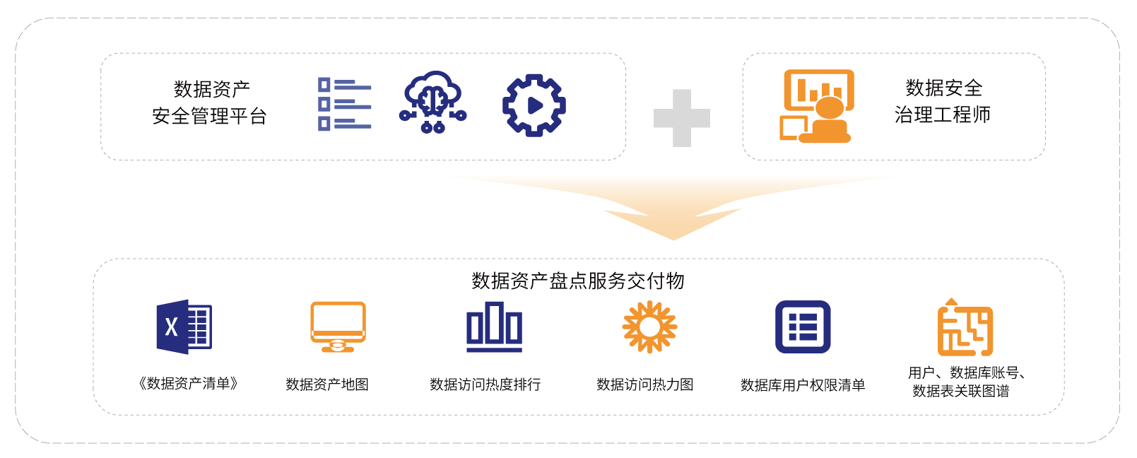 数据资产盘点服务:借助数据资产安全管理平台,为用户提供数据资产梳理、热度分析和数据库账户权限梳理服务。该服务通过对用户各类数据进行拉网式清查盘点,并以数据资产地图、数据资产目录等方式进行展现;对数据访问热度进行分析,绘制数据访问热力图;同时对数据库账号权限进行梳理,梳理出用户、数据库账号和数据表的关联图谱。