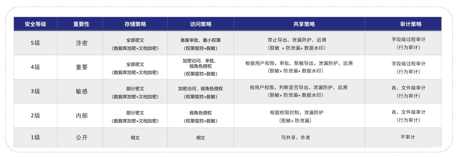 数据安全策略规划服务:根据客户数据分级的结果,对数据应用场景包含业务流程或使用流程、相关数据活动、参与主体进行分析,结合数据的级别,参照客户数据安全管理需求,从数据存储、数据访问、数据共享、数据审计等场景制定合适的数据安全防护策略方案,为客户数据安全防护提供依据支撑。